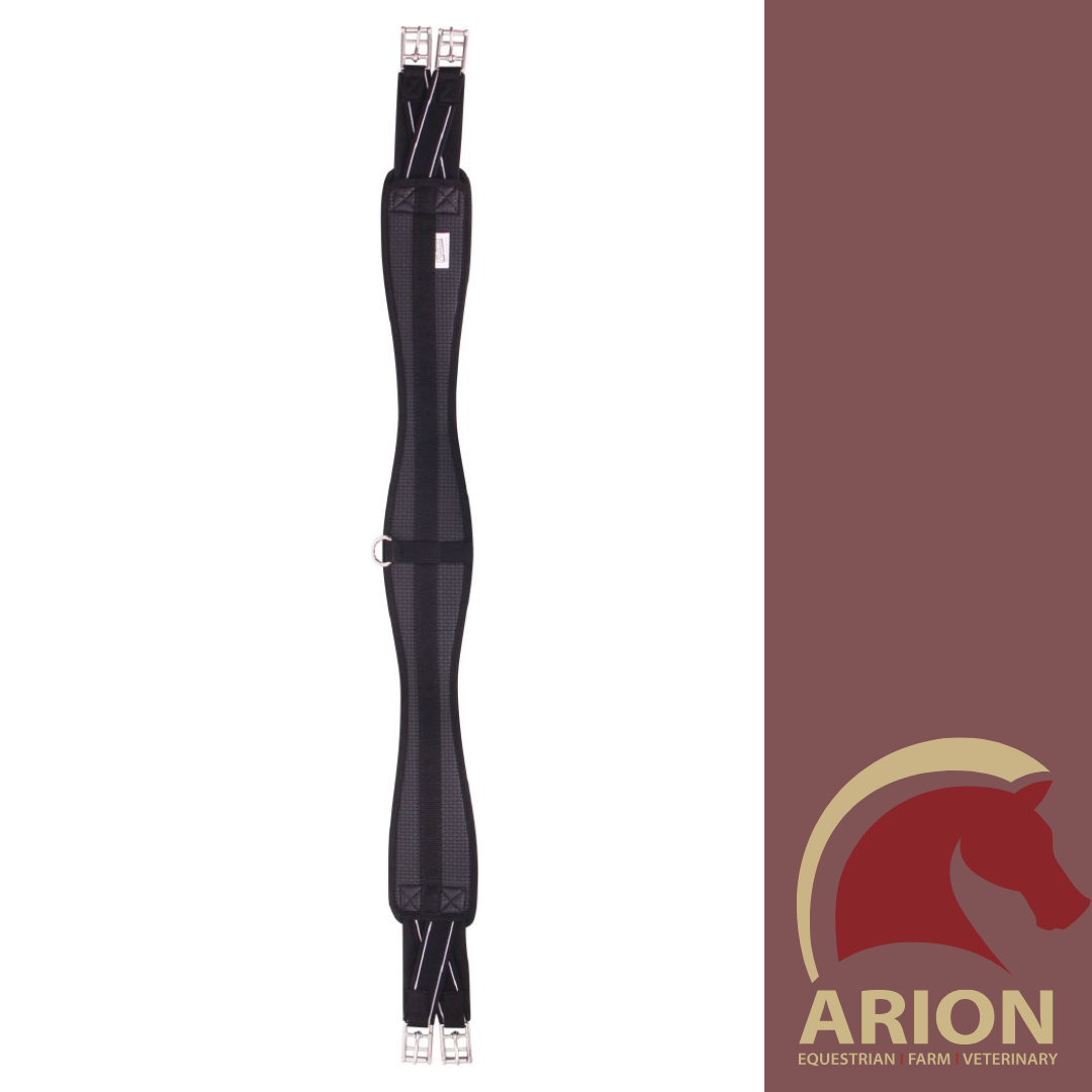 Anti Gall Double Buckle Girth.Textured Antigall fabric to allow airflow and shaped for extra comfort and freedom of movement.Elastic at both ends with stainless steel roller buckles.The Fabric is easy to wipe clean and maintain.Fitted with Centre D attachment.