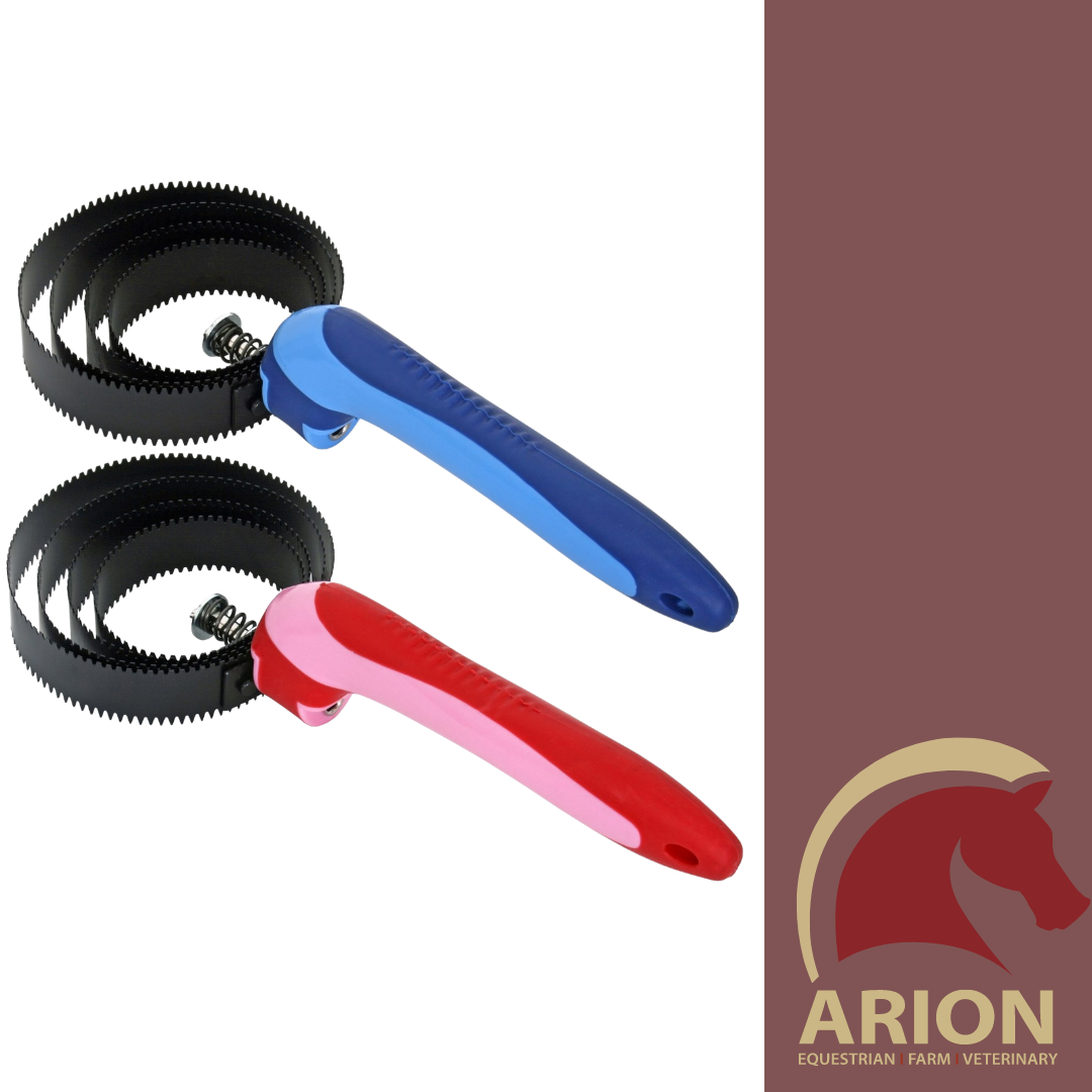 Two tone, Reversible Curry comb with Soft Grip handle.Four metal circular combs can be flipped over - Rough on one side, smoother on the other.Great for a shedding coat and pulling dead hair follicles from the coat.