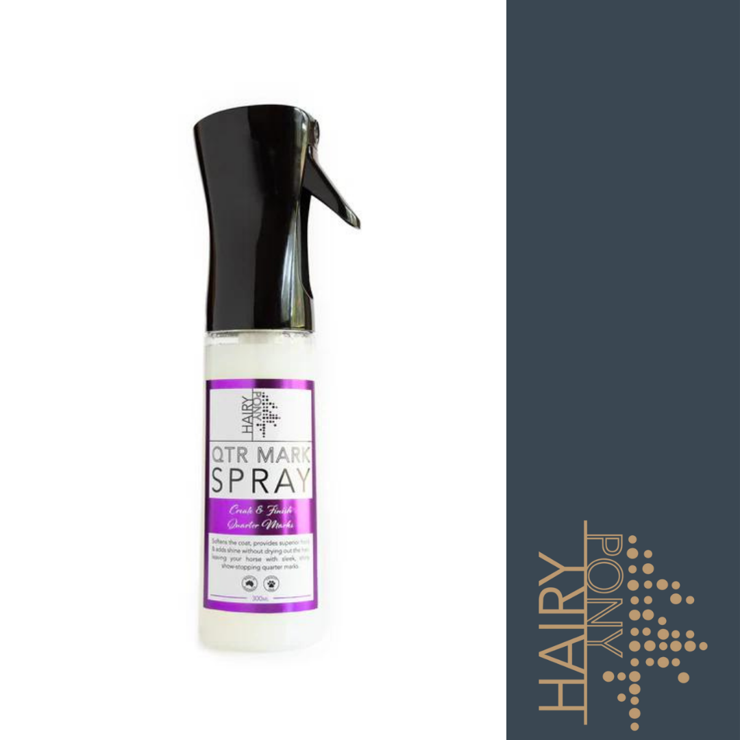 HAIRY PONY QUARTER MARK SPRAY softens the coat, provides superior hold & adds shine without drying out the hair, leaving your horse with sleek, shiny show-stopping quarter marks. Fine mist spray will add hold and keep your patterns all day!