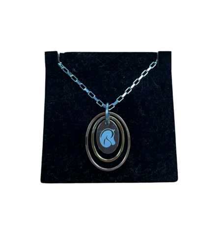 This charm is made of stainless steel and shows the RUBIN ROSS design stamped in the middle. The surrounding rings are processed with gold and copper plating. The large sized charm combines elegance with modern tricolor design. The 48 cm long stainless steel necklace well fits to the charm with its shiny rectangular links.