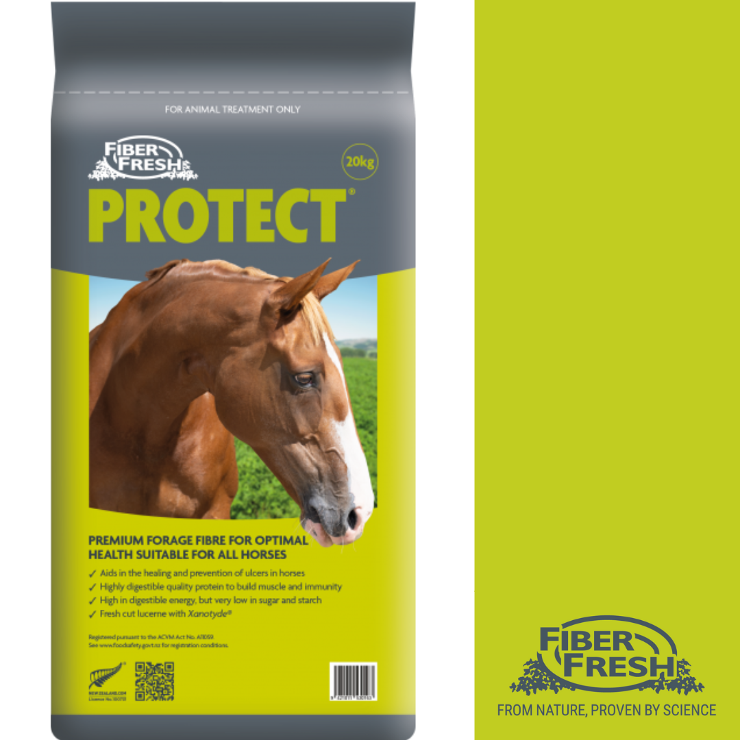 Fiber Protect® is a moist, highly digestible fibre feed comprising pure fresh-cut lucerne, ideal for all horses requiring top-quality fibre. It is the only feed product in New Zealand to be registered with ACVM to aid in the prevention and healing of gastric ulcers in horses.