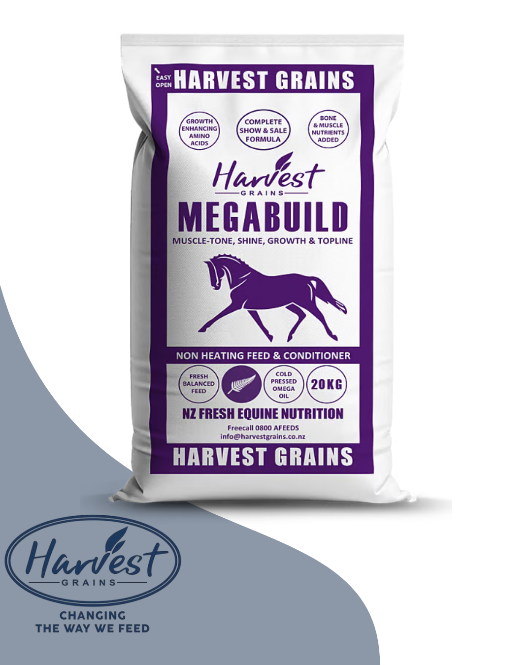 Give your horse the edge with Harvest Grains MegaBuild® — a balanced muesli with tasty calories and essential nutrients designed to enhance topline, shine, condition, and overall wellness.